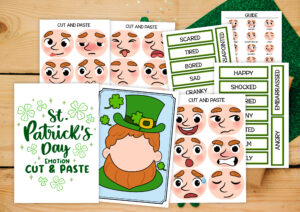 This set of free St Patrick’s Day activities will delight and challenge your child’s social emotional learning. And, you can use it all year long as a fun game! Here are some ideas for how to use this full color set that includes a leprechaun face sans eyes, nose, and mouth; 18 different facial expressions; labels for the expressions; and a guide, or answer key.